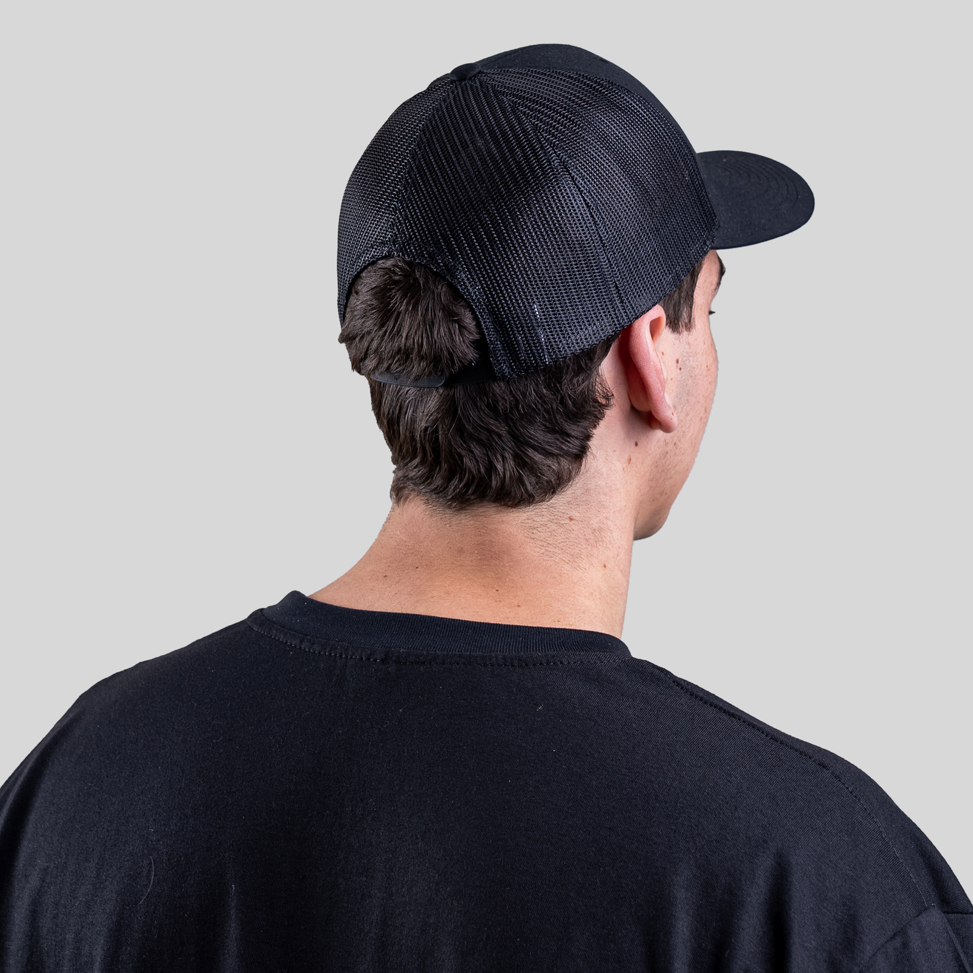 Gorro negro tipo trucker con malla trasera, perfecto para un look urbano y relajado. Parte frontal firme y curva clásica, con cierre ajustable para mayor comodidad. Combina estilo y ventilación, ideal para el día a día con un toque callejero y atemporal.